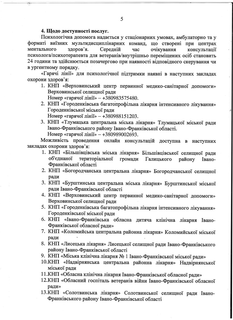 У районах є центри в Бурштині, Городенці, Долині, Коломиї, Надвірні, Калуші, Верховині та Косові. Середній час очікування консультації – 24 години для ветеранів та ВПО.