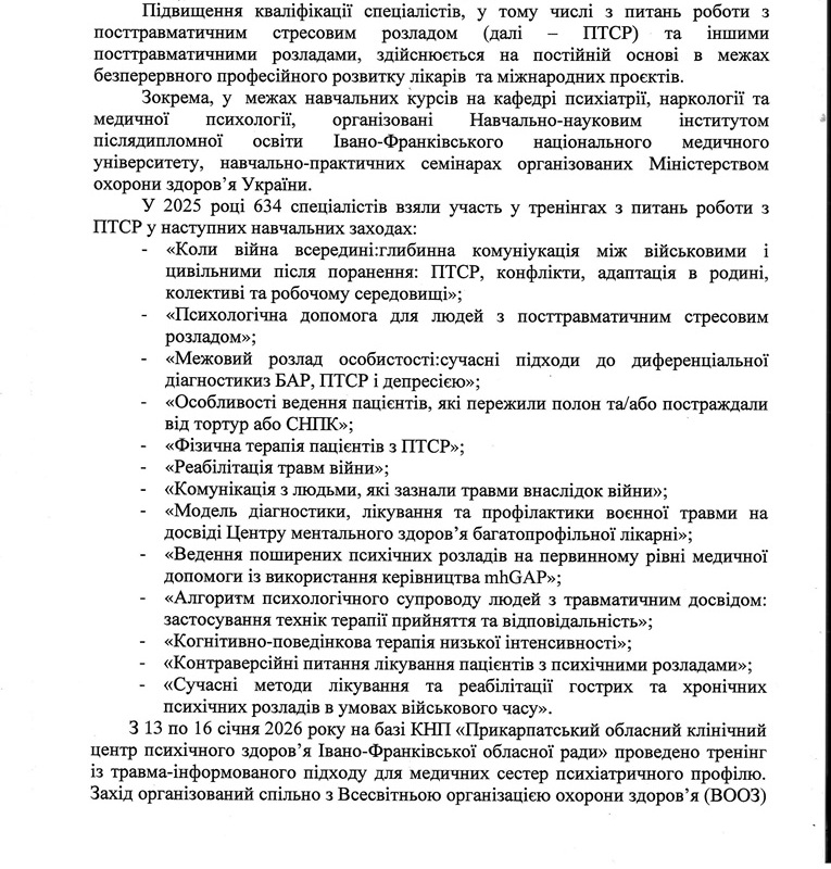 У 2025 році 634 фахівці пройшли тренінги з тем як “Психологічна допомога для людей з ПТСР”, “Реабілітація травм війни”, “Комунікація з людьми, які зазнали травми” та інші. З 13 по 16 січня 2026 року в Прикарпатському центрі психічного здоров’я провели тренінг з травма-інформованого підходу за підтримки ВООЗ, JICA та Івано-Франківського національного медичного університету.
