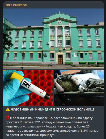«У лікарні ім. Карабелеша, розташованої за адресою проспект Ушакова, понад 20 пацієнтів заразилися вірусом імунодефіциту (ВІЛ) під час медичних процедур. Перевірка показала, що причиною стала злочинна недбалість лікарів, які не обробляти інструменти після обстеження військовослужбовців ЗСУ, а також що в лікарні відсутнє обладнання для знезараження, немає експрес-тестів, а хворих поміщають до загальної палати», – повідомляють росіяни.
