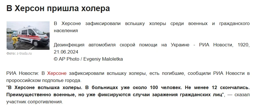 «Спалах холери» в Херсоні минулого року. Скриншот з сайту «БеZ Формата». Червень 2024 року.