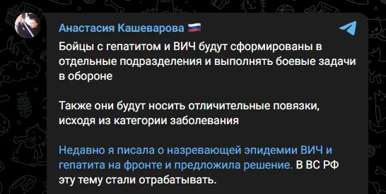 «Бійці з гепатитом та ВІЛ будуть сформовані в окремі підрозділи та виконуватимуть бойові завдання в обороні. Також вони носитимуть відмінні пов’язки, виходячи з категорії захворювання. Нещодавно я писала про прийдешню епідемію ВІЛ та гепатиту на фронті й запропонувала рішення. У ЗС РФ цю тему почали відпрацьовувати», – повідомляє на своєму Telegram-каналі російська пропагандистка Анастасія Кашеварова.