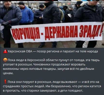 “Поки люди на Херсонщині пухнуть від голоду, ці тварини потопають у розкошах. Чиновники продовжують красти мільйони через липові тендери, купуючи все за подвійними цінами. Поки вони бенкетують у розкоші, люди виживають — і все це на стражданнях простих людей. Їм байдуже, що регіон котиться у прірву, що люди похилого віку замерзають, а діти голодують”, – зазначають росіяни.