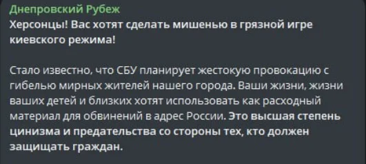 “Ваші життя, а також життя ваших дітей та близьких планується використовувати як витратний матеріал для необґрунтованих звинувачень на адресу Росії та випрошуючи грошей у Західних Господарів. Провокація очікується у Херсоні, проте не виключено, що ці терористи можуть здійснити подібні дії у будь-якому місті чи селищі”, – повідомляють кремлівські пропагандисти.
