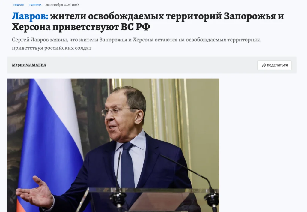 “Росія діє з турботою про майбутнє місцевого населення, а не з імперських мотивів. Люди залишаються у своїх домівках і підтримують російських військових, бо відчувають духовну єдність із російською культурою”, — цитують безглузді заяви міністра закордонних справ РФ Сєрґєя Лаврова російські медіа.
