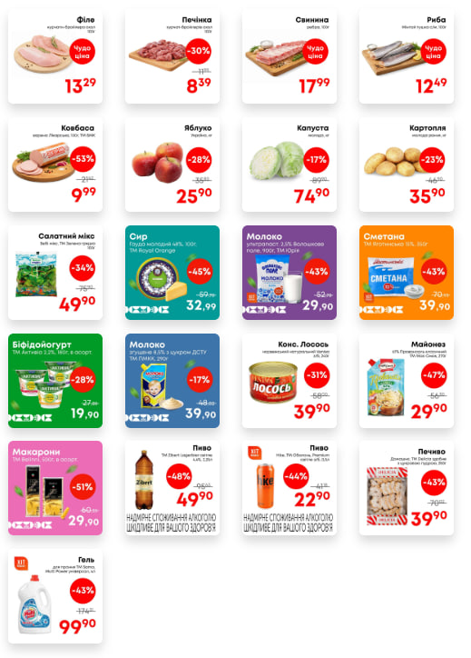 Цього тижня під акційні пропозиції потрапили товари з різних категорій. У супермаркеті відкритий великий вибір кондитерських виробів, снеків та напоїв як алкогольних, так і безалкогольних тощо. Також полтавці можуть придбати зі знижками свіжу молочну продукцію, консерви, м’ясо або рибу.