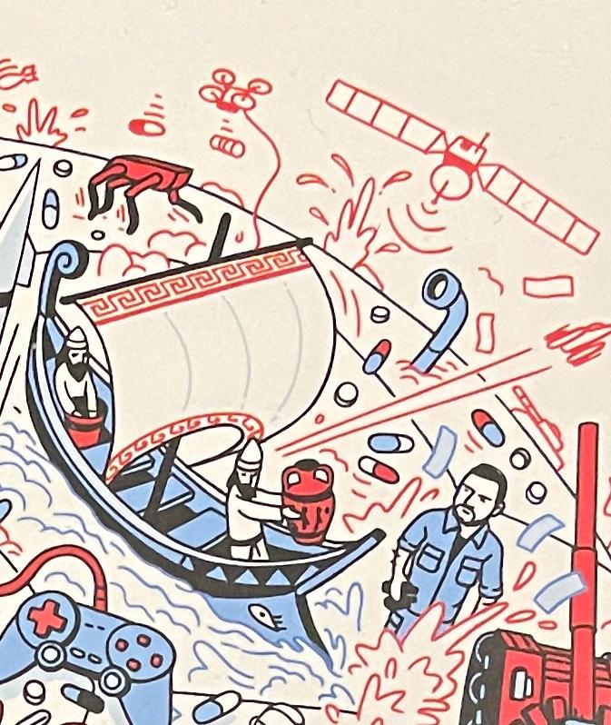 А найцікавішим і найважче тракованим на обкладинці є епізод з парусним човном ліворуч від Зеленського, – чи то грецьким, чи то варязьким.