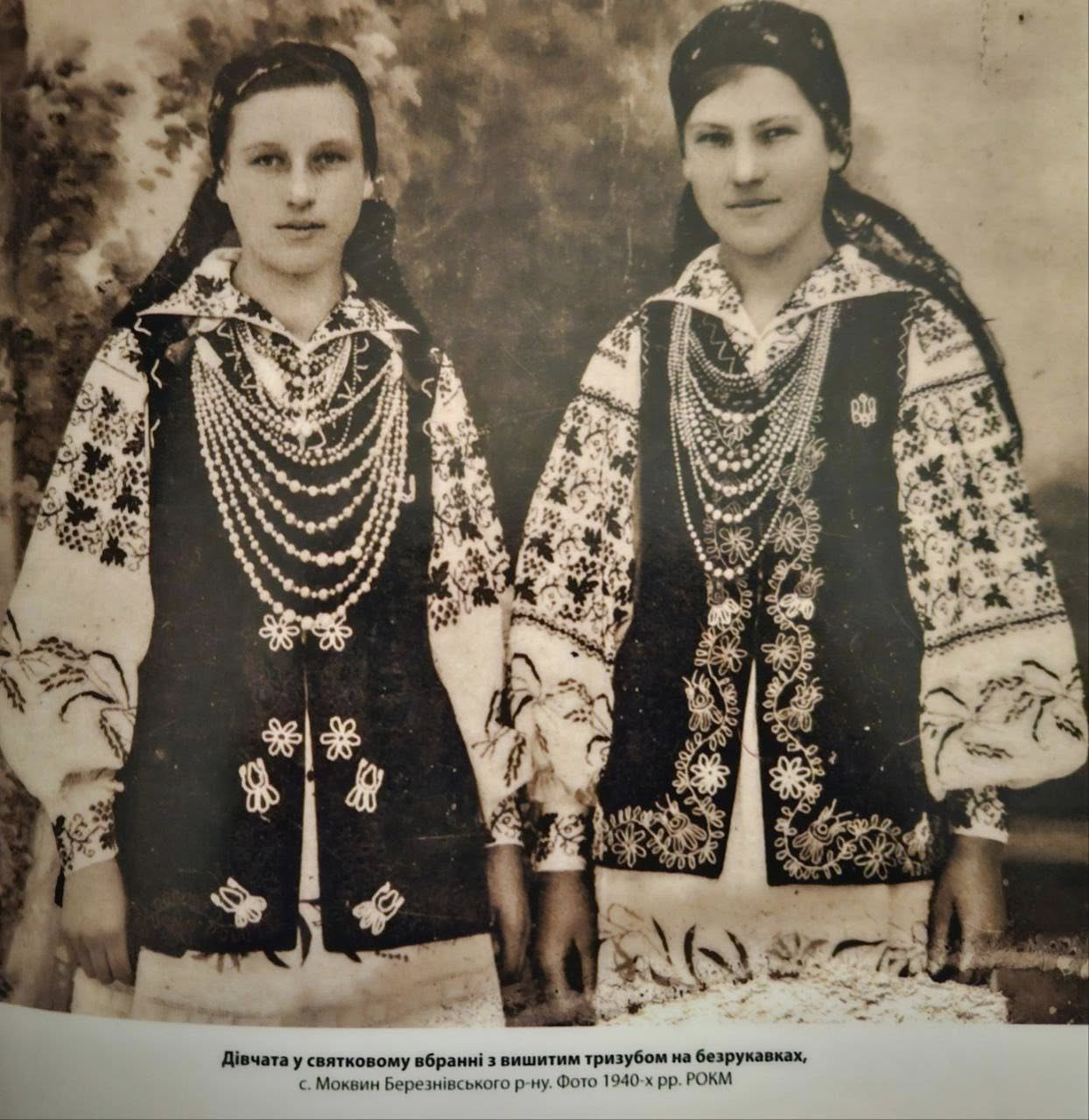 Серед експонатів — і світлина 1940-х років із села Моквин на Березнівщині, де українські дівчата зображені у святковому вбранні з вишитими тризубами.