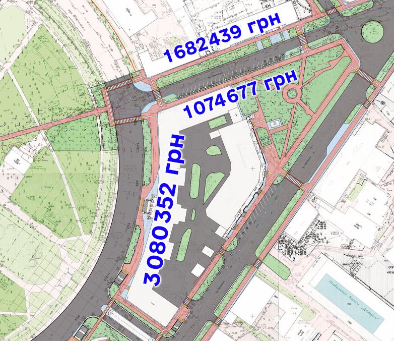 • вул. Соборності, 36 (тротуар вздовж фасадної частини міськради) — 3 080 352 грн.