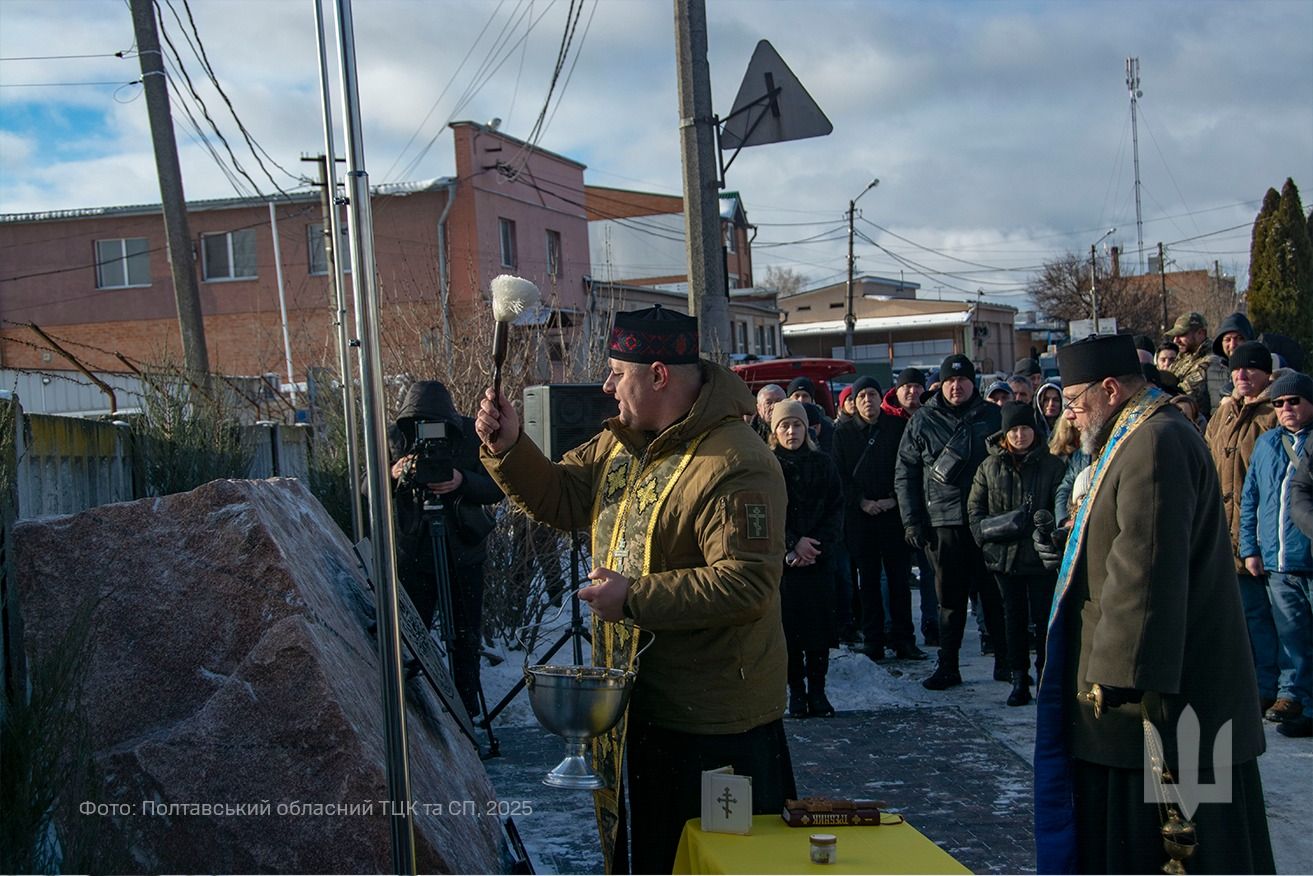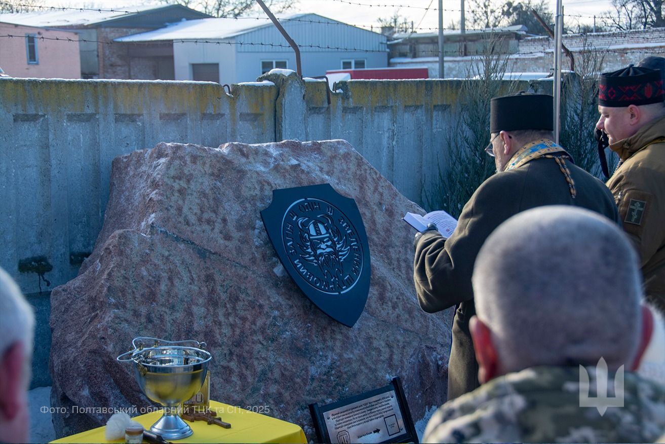 Пам’ятний знак полтавської зведеної штурмової роти «Одін» — це камінь зі зображенням шеврона та плита з інформацією про бойовий шлях штурмової роти.