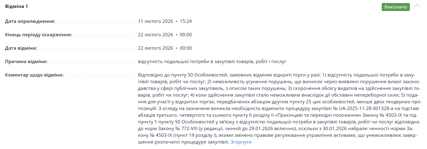 - 11 лютого 2026 року: АРМА офіційно скасовує закупівлю послуг з управління активами на Prozorro. Конкурс визнано таким, що не відбувся.