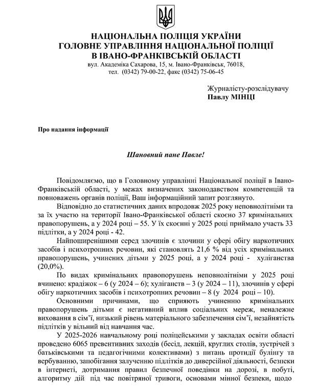 Нам відповів Ігор Влашин, тимчасово виконувач обов’язків заступника начальника Головного управління Національної поліції в Івано-Франківській області. Документ підписано 9 лютого 2026 року, і в ньому детально викладено статистичні дані та пояснення ситуації з підлітковою злочинністю в регіоні.