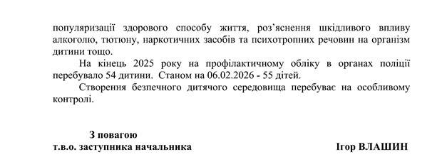На кінець 2025 року на профілактичному обліку в органах поліції перебувало 54 дитини, а станом на 6 лютого 2026 року — уже 55. Поліція підкреслює, що створення безпечного середовища для дітей перебуває на особливому контролі.
