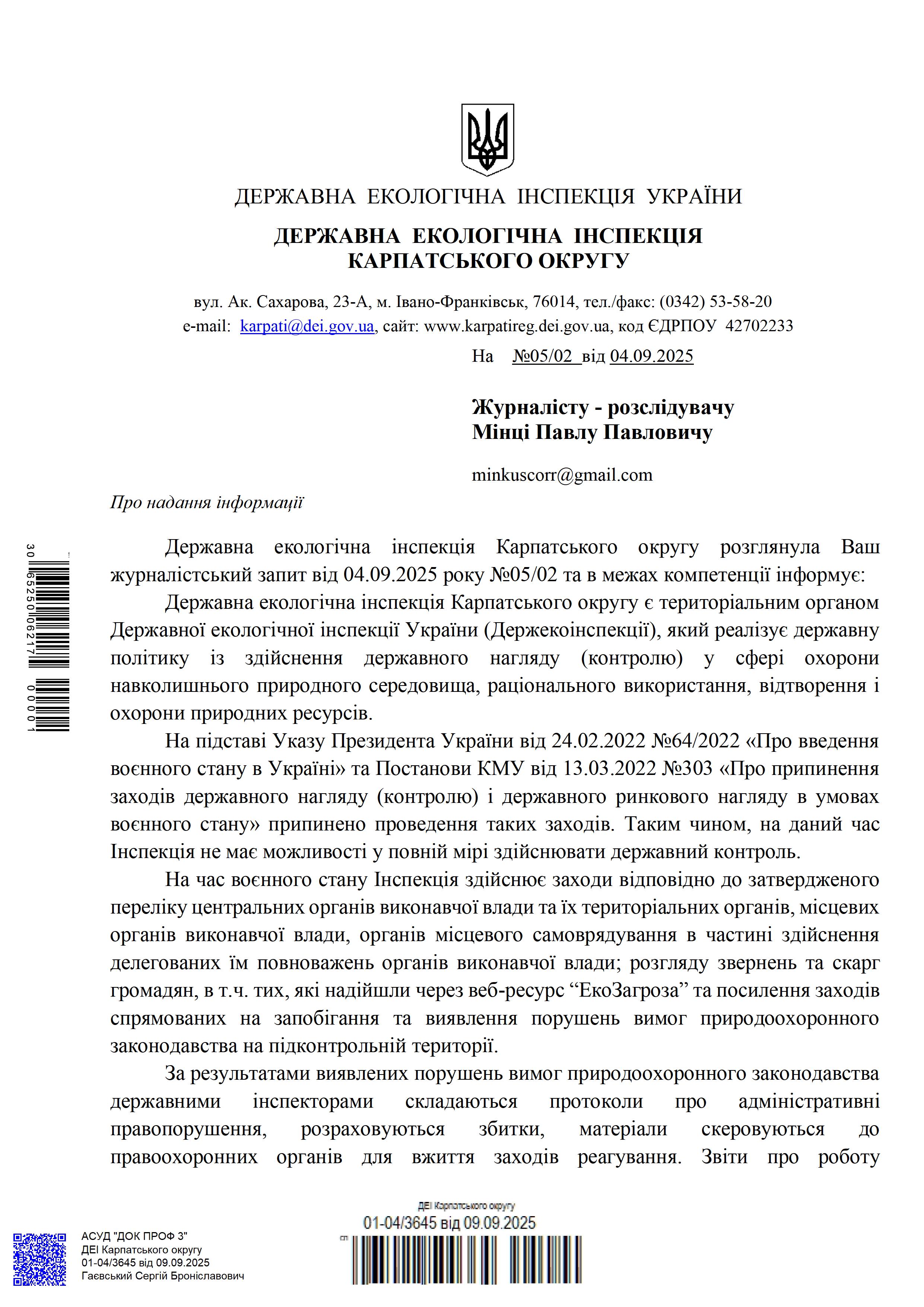 Щоб з’ясувати актуальний стан справ і отримати офіційну картину зафіксованих проблем, Фіртка звернулася до Державної екологічної інспекції Карпатського округу — ключового органу, який відповідає за нагляд за довкіллям у регіоні, щоб дізнатися про виявлені порушення, розрахунки збитків і заходи реагування за період із 2022 по вересень 2025 року.