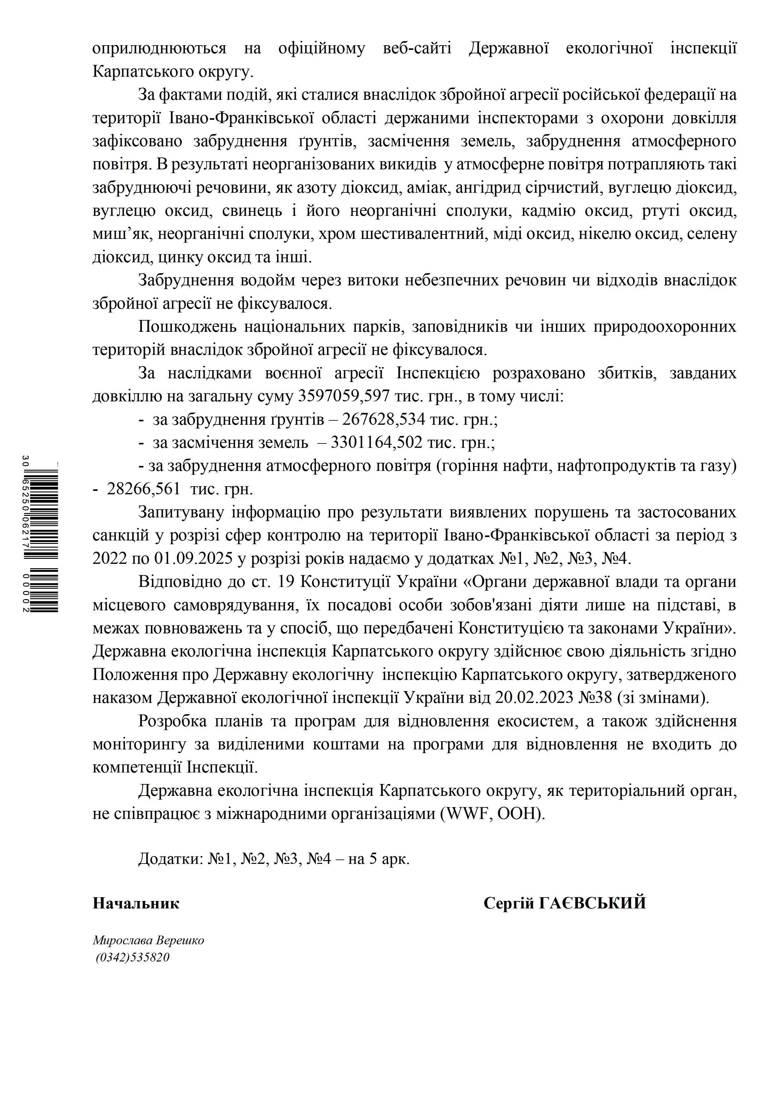 Щоб з’ясувати актуальний стан справ і отримати офіційну картину зафіксованих проблем, Фіртка звернулася до Державної екологічної інспекції Карпатського округу — ключового органу, який відповідає за нагляд за довкіллям у регіоні, щоб дізнатися про виявлені порушення, розрахунки збитків і заходи реагування за період із 2022 по вересень 2025 року.