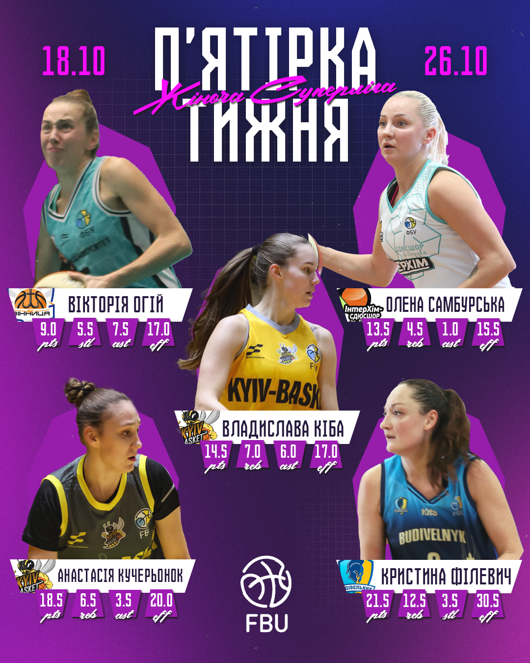 Анастасія Кучерьонок (Київ-Баскет) — 18.5 очка, 6.5 підбирання, 3.5 передачі. РЕ 20.0