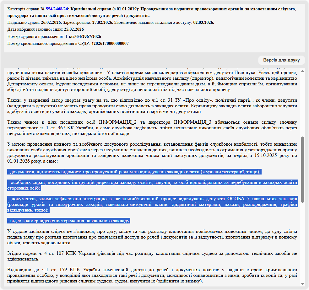 25 лютого Шевченківський районний суд Полтави розглянув клопотання слідчого про тимчасовий доступ до речей і документів у вище названому кримінальному провадженні, передбаченого ч. 1 ст. 367 КК України.