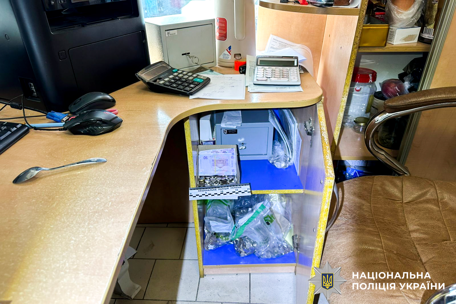 Поліцейські встановили, що невідома особа напередодні ввечері шляхом віджиму металопластикових дверей заступом і металевою трубою, проникла до магазину та з незамкненого сейфу викрала 100 тисяч гривень.