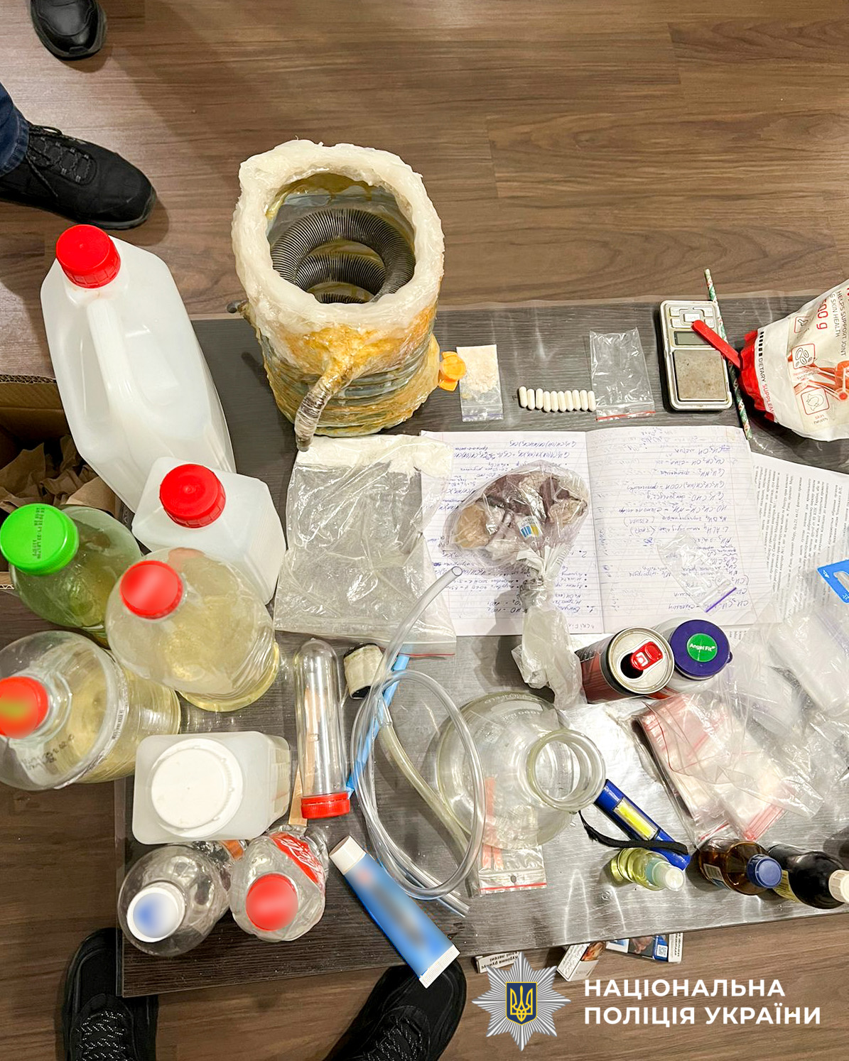 Під час санкціонованого обшуку за місцем проживання 39-річного рівнянина поліцейські виявили та вилучили 2 пакети із метамфетаміном, 8 ємностей з прекурсорами, лабораторне обладнання, фасувальні зіп-пакети та електронні ваги.