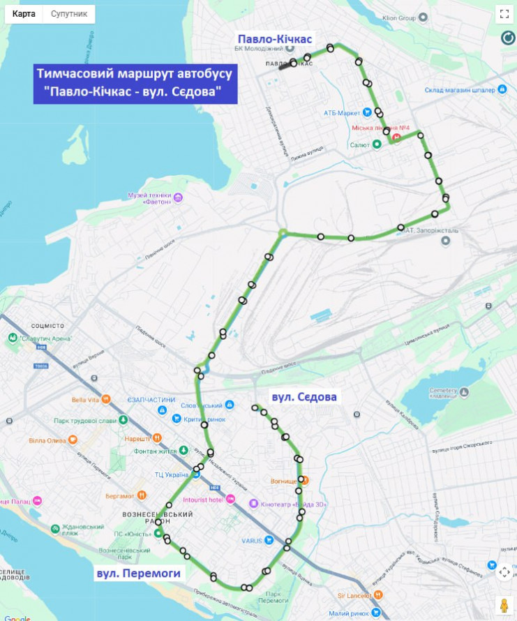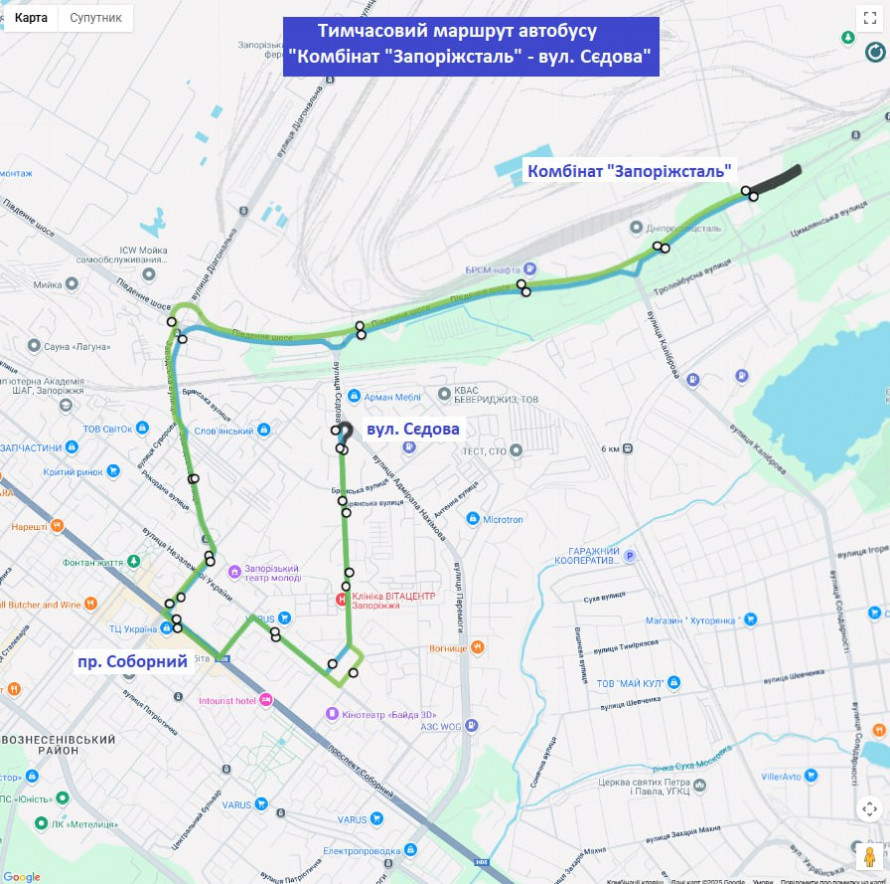 – додатковий автобус “Комбінат “Запоріжсталь” – вулиця Сєдова” за напрямком: Комбінат “Запоріжсталь” – Південне шосе – вулиця Діагональна – вулиця Вячеслава Зайцева – проспект Соборний — вулиця Якова Новицького – вулиця Сєдова;