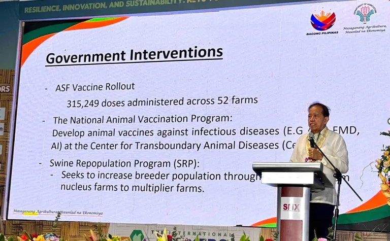 На фото пан Констант Д. Палабрикою представляє початок державної програми вакцинопрофілактики АЧС в Філіппінах.