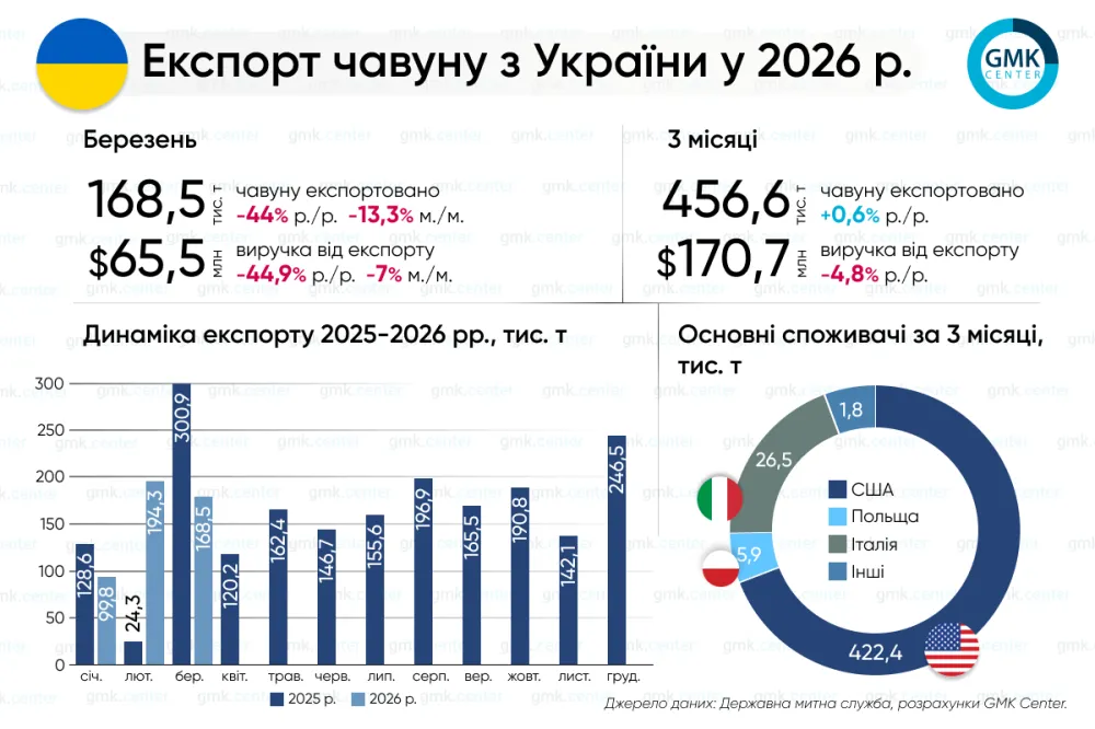 Металургійні підприємства України за підсумками січня-березня 2026 року збільшили експорт товарного чавуну на 0,6% порівняно з аналогічним періодом 2025 року – до 456,63 тис. т. Порівняно з попереднім кварталом обсяги впали на 21,2%. Про це свідчать розрахунки GMK Center на основі даних Державної митної служби, пише agronews.ua.