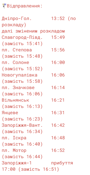 • Із Запоріжжя-1: відправлення о 19:20, прибуття до Дніпра о 21:45. Час у дорозі — 2 год. 25 хв.