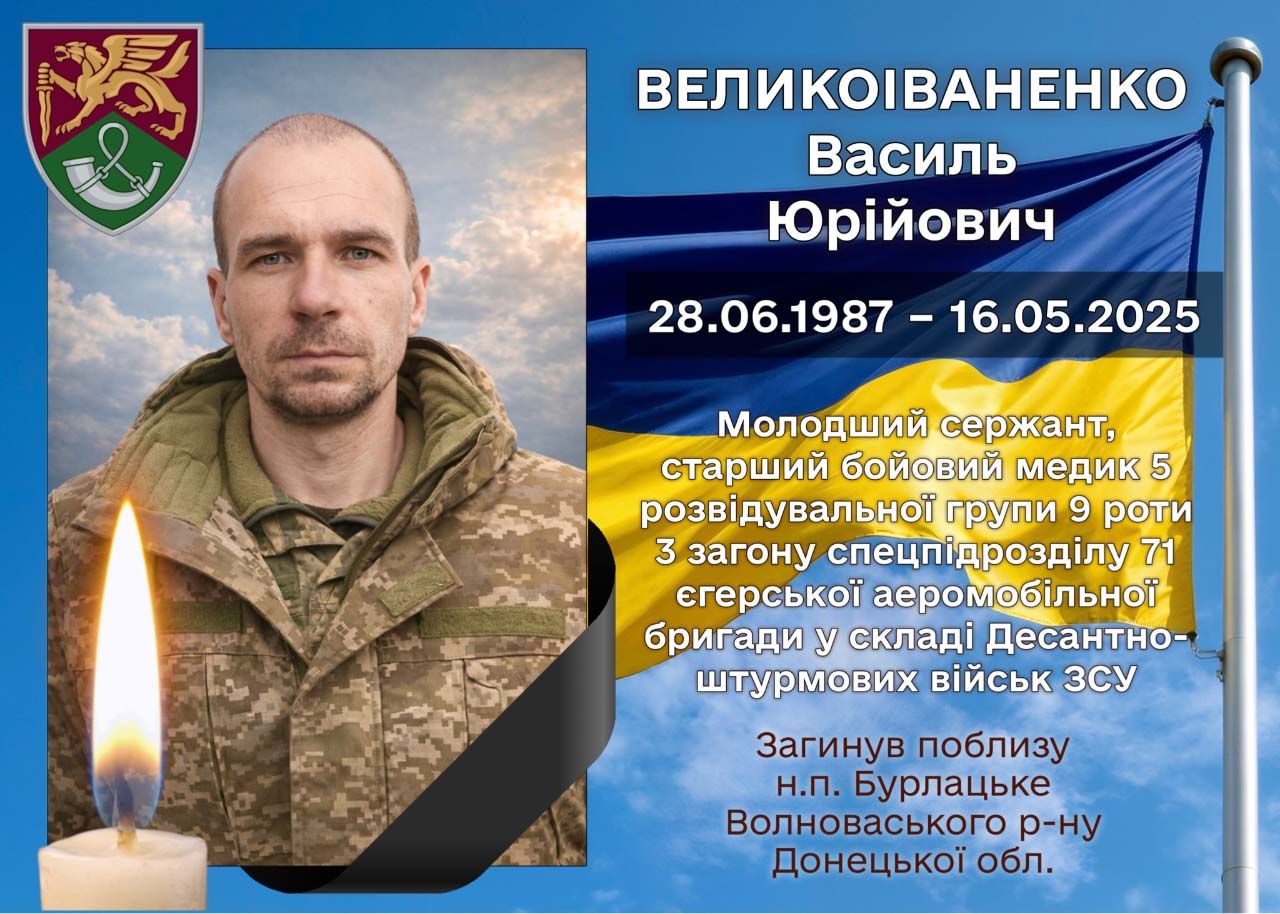 За інформацією Хорольської міської ради, 16 травня 2025 року під час виконання бойового завдання поблизу селища Бурлацьке Волноваського району Донецької області зник безвісти Великоіваненко Василь Юрійович — молодший сержант, старший бойовий медик розвідувальної групи спецпідрозділу 71-ї окремої єгерської бригади.