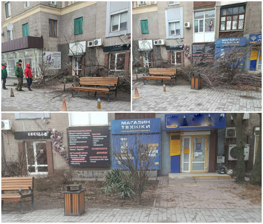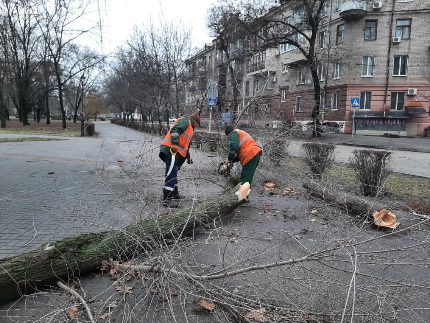 У різних районах Запоріжжя комунальники прибирають повалені дерева, гілки та пошкоджені конструкції після сильних поривів вітру