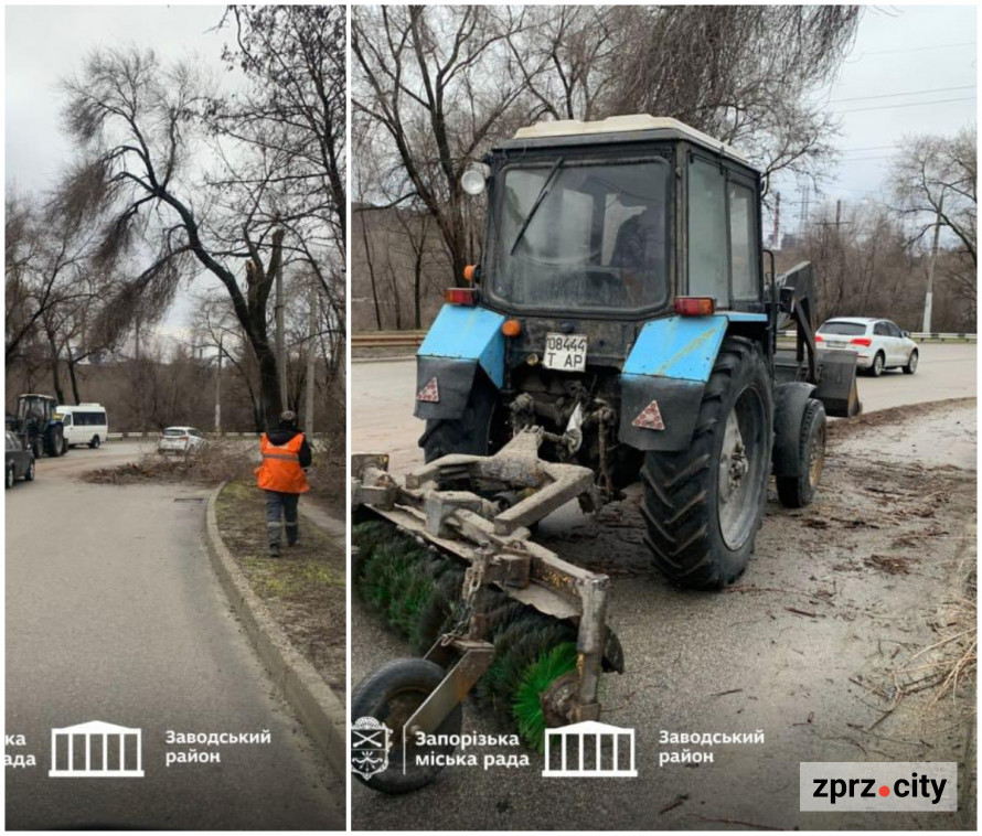 «Запоріжремсервіс» працює без зупинок, аби привести місто до ладу. Зелені будівельники розчищають проїзди та пішохідні зони від поваленої деревини, подрібнюють її та вивозять.