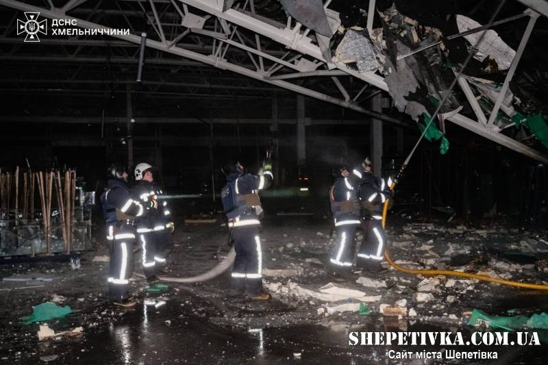 “Внаслідок російської атаки виникла пожежа на одному з підприємств у Хмельницькому районі. Пожежу ліквідовано підрозділами ДСНС.”